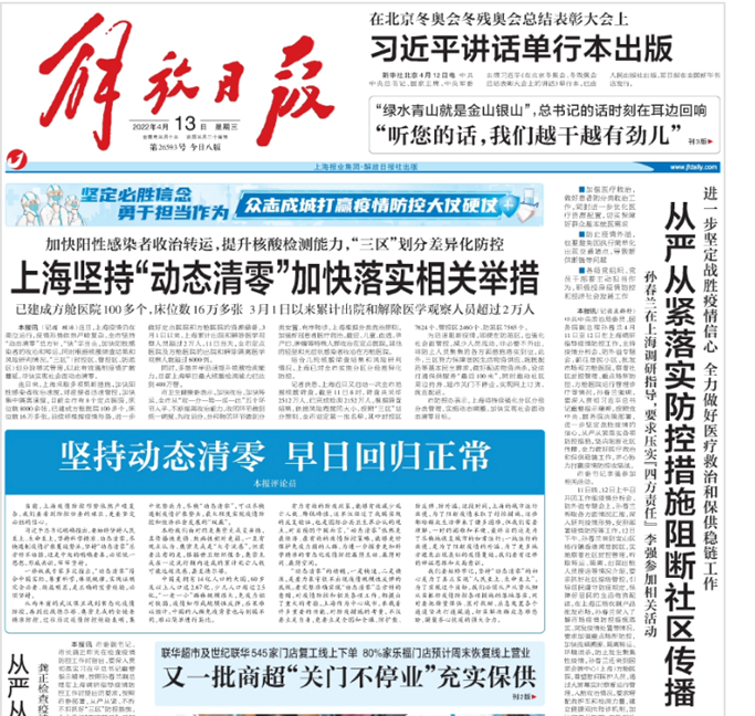 政知君注意到,4月13日,《解放日报》头版刊发了评论文章——《坚持动态清零 早日回归正常》。
