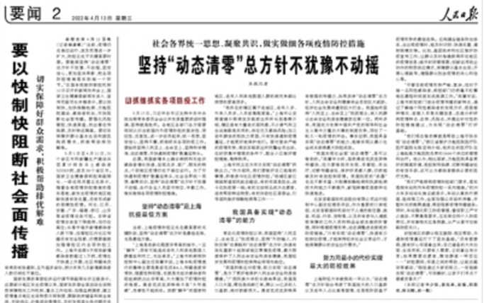 同一天,《人民日报》第二版刊发文章,《坚持“动态清零”总方针不犹豫不动摇》。
