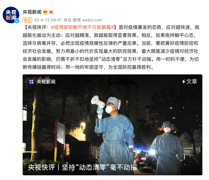 政知君注意到,就在4月13日,央视新闻发表评论《坚持“动态清零”毫不动摇》。