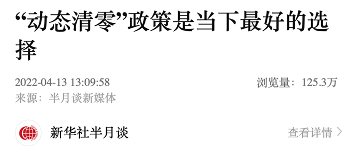另外,据《半月谈》4月13日报道,“新冠病毒共存论”“躺平论”又频频出现,关于“动态清零”的讨论也不少。
