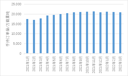 集装箱船方面,2022年一季度,全球成交新船订单137艘1080万载重吨,同比下降46.6%,具体订单包括57艘支线型箱船、36艘中型集装箱船、13艘大型集装箱船和31艘超大型集装箱船。散货船方面,2022年一季度,全球成交新船订单36艘276万载重吨,同比下降77.2%,具体订单包括6艘好望角型散货船和20艘灵便型散货船。油船方面,2022年一季度,全球成交新船订单10艘44万载重吨,同比下降96.3%,具体订单包括3艘成品油船和7艘化学品船。气体运输船方面,2022年一季度,全球成交新船订单39艘365万载重吨,同比增加93.1%,具体订单包括37艘大型LNG船和2艘LPG船。随着欧洲寻求能源供应网络的多元化,以及俄罗斯进口管道天然气供应的减少,美国页岩气对欧洲的海上出口有望增长,这将在一定程度上为LNG船的中长期市场发展创造机遇。