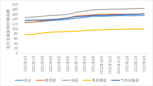 截至2022年一季度末,克拉克森新船价格指数收于156点,环比基本持平,同比增长19.8%。从主力船型看,散货船、油船、集装箱船和气体运输船的克拉克森新船价格指数分别为162点、183点、100点和162点,环比基本持平,同比分别增长21.6%、21%、20.2%、19%。从典型船型看,各典型船型新船价格均有上涨,VLCC、2.3万TEU箱船和17.4万立方米LNG船的新船价格已分别达到1.15亿美元、2亿美元和2.2亿美元的高位水平。