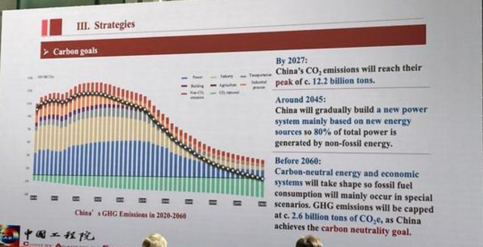 3月31日,中国工程院在北京发布重大咨询项目成果《中国碳达峰碳中和战略及路径》。其中提出,通过积极主动作为,全社会共同努力,中国二氧化碳排放有望于2027年前后实现达峰,峰值控制在122亿吨左右。在此基础上推动发展模式实现根本转变,可在2060年前实现碳中和。
