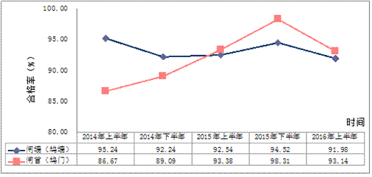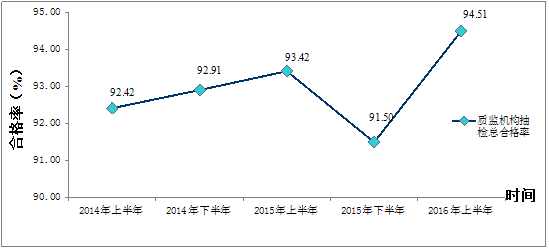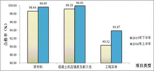 2016年上半年,质监机构对全国水运工程共检测数据195263个,合格184540个,抽检合格率为94.51%,与2015年上半年相比(以下称为“同比”)上升1.09个百分点,与2015年下半年相比(以下称为“环比”)上升3.01个百分点,如图1所示。