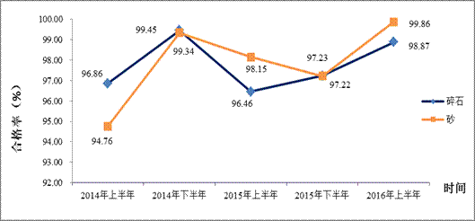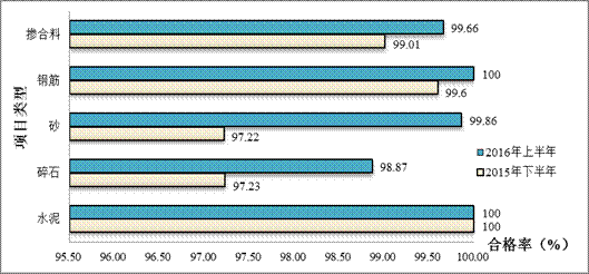 2016年上半年,混凝土原材料质量抽检合格率为99.65%,环比上升1.01个百分点。如图3所示,混凝土原材料抽检指标中碎石、砂、钢筋和掺合料等4个分项指标的抽检合格率环比分别上升1.64、2.64、0.40、0.65个百分点。如图4所示,碎石、砂的抽检合格率同比分别上升2.41、1.71个百分点,其中,砂的抽检合格率为2014年下半年以来的首次上升。上述检测数据表明,各地加强进场材料的质量检验,原材料质量总体较好。