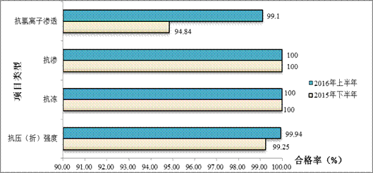 2016年上半年,混凝土强度及耐久性抽检合格率为99.93%,环比上升0.75个百分点。如图5所示,混凝土强度和耐久性抽检指标中抗氯离子渗透、抗压(折)强度的合格率环比分别上升4.26、0.69个百分点,抗渗和抗冻2项指标保持在100%。如图6所示,抗氯离子渗透这一指标从2014年下半年至2015年下半年的合格率均呈现下降趋势,今年上半年上升幅度较大。上述检测数据表明,混凝土质量耐久性指标的验证性检测工作有所加强。