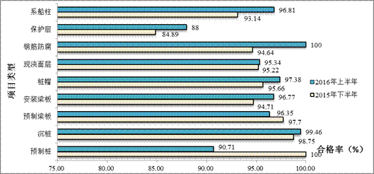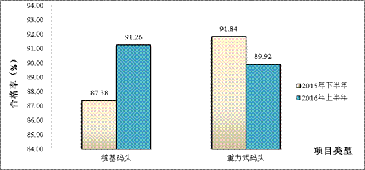 如图7所示,2016上半年,港口码头、港区道路堆场、航道整治、船闸船坞等4类工程实体的质量抽检总体合格率分别为90.60%、89.10%、95.74%、95.14%,其中,港口码头、航道整治、船闸船坞等3类指标的合格率环比分别上升2.35、0.38、0.27个百分点,港区道路堆场的合格率环比下降1.15个百分点。