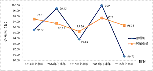 2016年上半年,桩基码头工程质量检测总体合格率为91.26%,环比上升3.88个百分点。如图9所示,桩基码头工程抽检9项分项指标中7项上升、2项下降,其中,预制桩、预制梁板等2项指标的合格率环比分别下降9.29、1.35个百分点,如图10所示,2014年上半年以来,预制桩抽检合格率波动明显。上述抽检数据表明,预制构件质量呈下降趋势,应引起更多的关注。究其原因,预制桩问题主要出在地方中小型码头工程,预制桩外周长等几何尺寸、混凝土保护层的偏差大,接桩部位错台明显,这与中小型项目对预制工艺控制不到位,施工过程质量检验把关不严等因素有关。