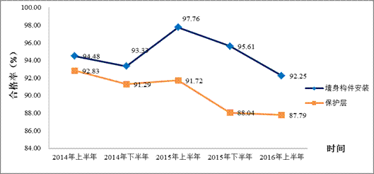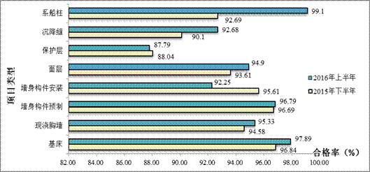 2016年上半年,重力式码头工程实体质量抽检合格率为89.92%,环比下降1.92个百分点。如图11所示,重力式码头工程抽检8项分项指标中有6项上升、2项下降,其中系船柱的合格率有较大增幅,环比上升6.41个百分点,如图12所示,墙身构件安装、保护层等两项指标的合格率环比分别下降3.36、0.25个百分点,同比分别下降5.51、3.93个百分点,呈下降趋势。上述检测数据表明,重力式码头构件安装精度有待提升,混凝土保护层施工较随意,究其原因,这与现场作业人员素质不高,现场施工“三检制”执行不严格等有关。