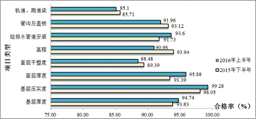 2016年上半年,港区道路堆场工程实体的检测总体合格率为89.10%,环比下降1.15个百分点。如图13所示,港区道路堆场工程抽检8项分项指标中4项上升、4项下降,其中,面层平整度、高程、管沟及盖板、轨道及跑道梁等4项指标的合格率环比分别下降0.91、2.98、1.16、0.61个百分点。如图14所示,2014年下半年以来,面层平整度、高程、管沟及盖板、轨道及跑道梁等四项指标合格率呈下降趋势,这4项指标是体现道路堆场工程表观质量的主要指标,应引起重视。上述检测数据表明,港区道路堆场中小型预制构件等细部质量问题较多。究其原因,这与参建单位“重主体轻附属”,总包单位现场指导把控不力等有关。