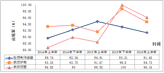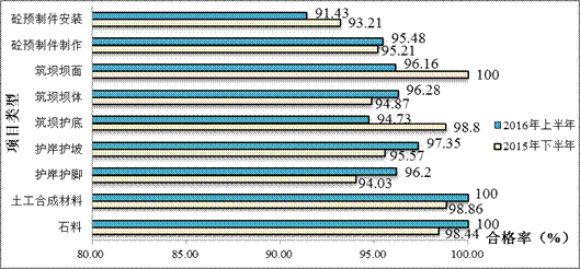 2016年上半年,航道整治工程实体质量抽检总体合格率为95.74%,环比提高0.38个百分点。如图15和图16所示,航道整治工程抽检9项指标中6项上升、3项下降,其中护岸护脚环比提升2.17个百分点,提升幅度较大,砼预制件安装、筑坝护底和筑坝坝面等3项分项指标的合格率分别为91.43%、94.73%、96.16%,环比分别下降1.78、4.07、3.84个百分点,且砼预制件安装的合格率呈下降趋势。上述抽检数据表明,部分项目存在预制块安装不到位、块石漏抛等质量通病问题,究其原因,这与航道整治工程隐蔽环节多、施工粗放、质量通病治理效果不明显等有关。