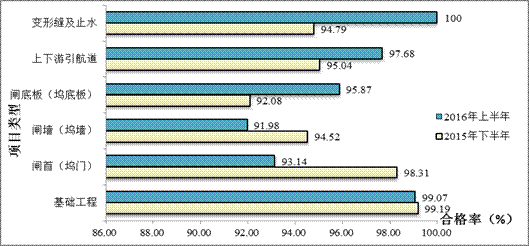 2016年上半年,船闸船坞工程实体质量抽检合格率为95.14%,环比上升0.27个百分点。如图17和图18所示,船闸船坞工程抽检6项指标中3项上升、3项下降,其中变形缝及止水环比上升5.21个百分点,上升幅度较大,闸首(坞门)、闸墙(坞墙)等2项指标的抽检合格率环比分别下降5.21、2.54个百分点,波动明显。上述抽检数据说明,虽然总体合格率基本持平,但个别分项工程质量出现波动,究其原因,这与施工标准化推广运用不足,一线作业人员对钢筋、模板制作安装控制不严等有关。